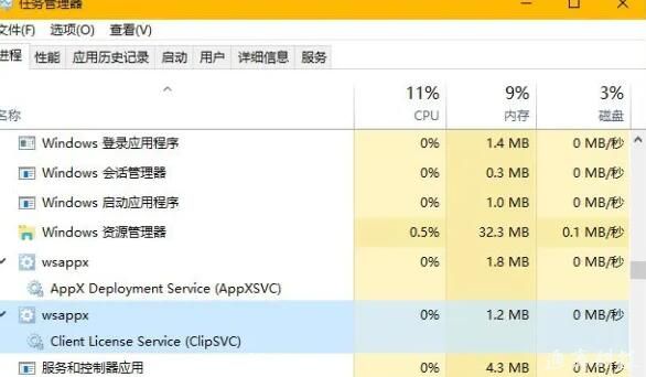 我們在wsappx運行時,打開任務管理器,將其展開,通常會發(fā)現(xiàn)里面顯示的是“Client License Service”或“AppX Deployment Service ”。不過單單看這個名字,我們是搞不清楚它是干什么的。